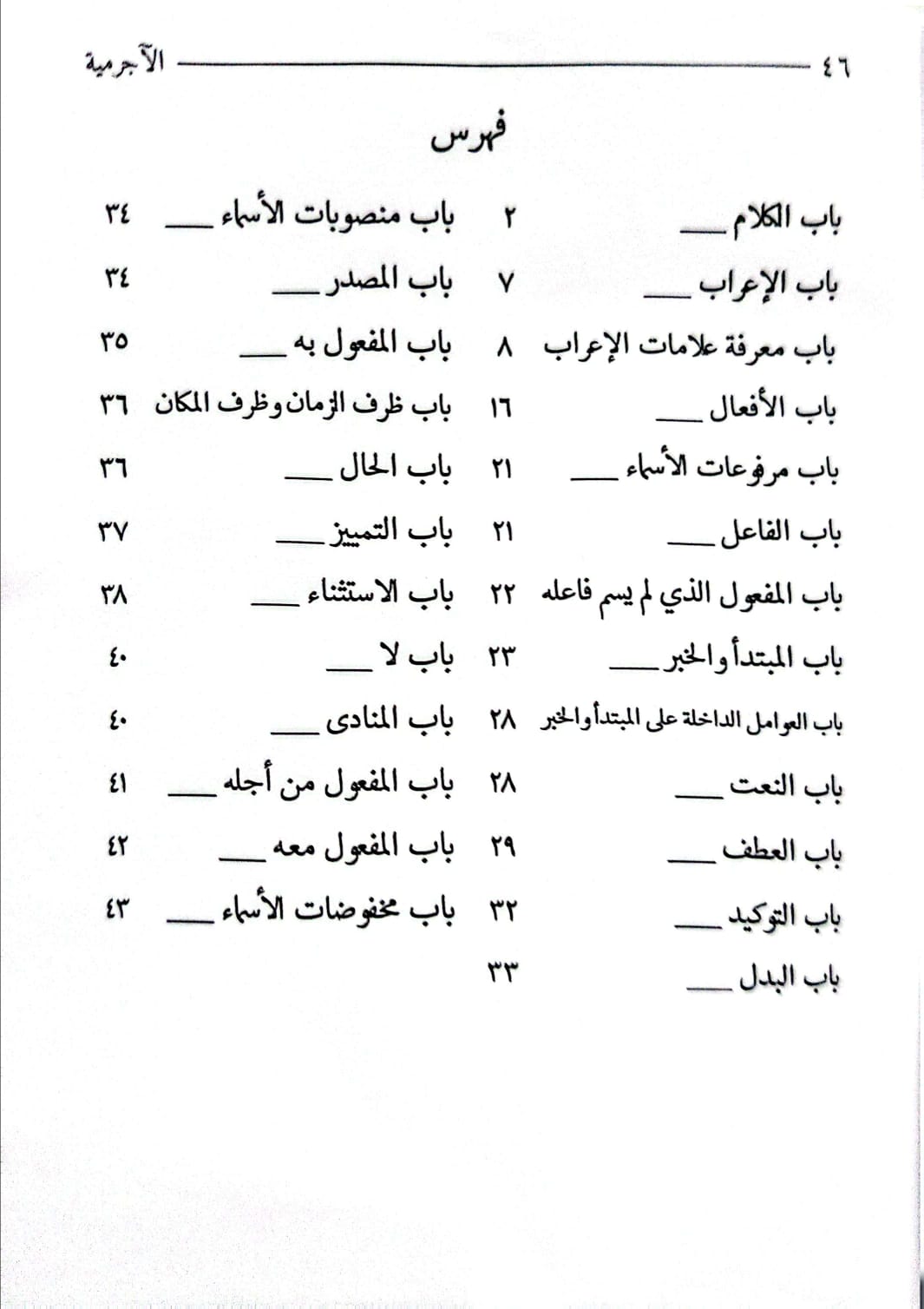 Kitab Jurumiyyah berisi teori-teori dasar ilmu nahwu, salah satu cabang ilmu bahasa Arab yang membahas perubahan huruf akhir dari sebuah kata yang menjadi tanda kedudukan kata tersebut dalam sebuah kalimat, apakah kata itu berposisi sebagai subjek, predikat, objek, atau keterangan tambahan.