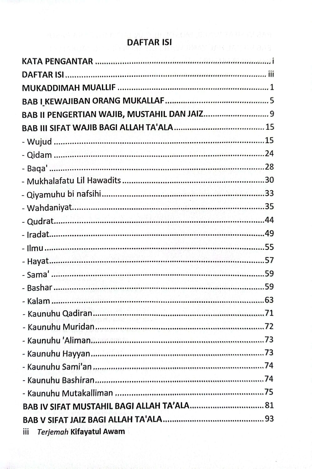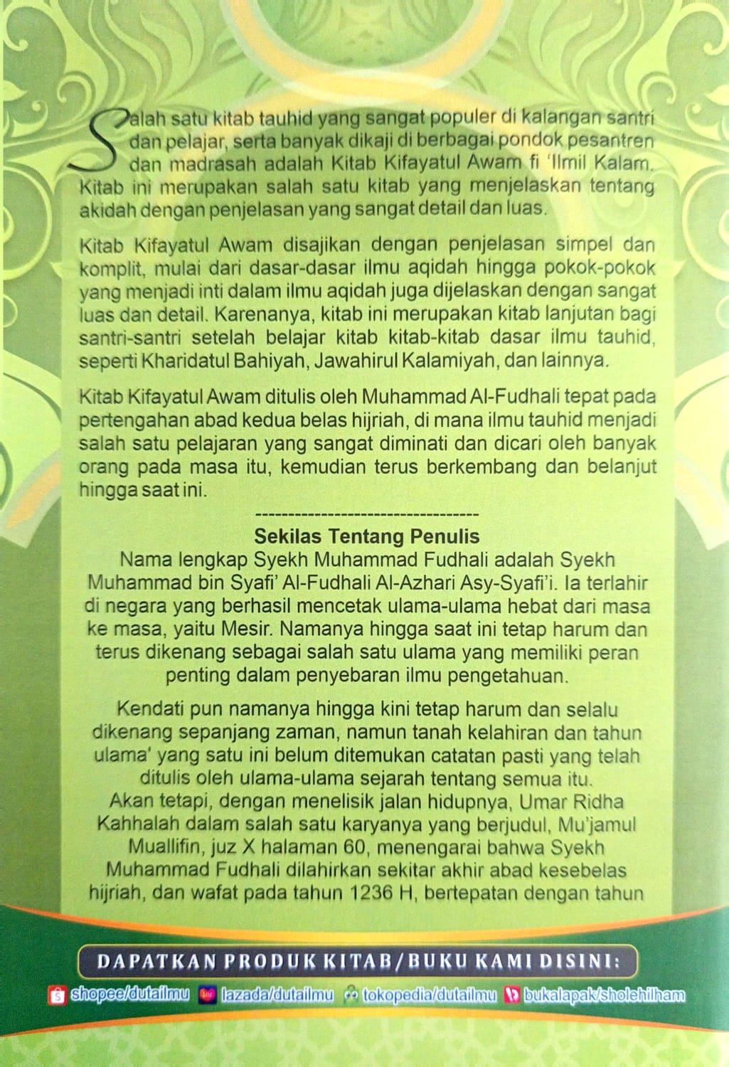 Terjemah Kitab Kifayatul Awwam (Arab–Indonesia) merupakan edisi terjemahan dari karya ulama terkemuka Syaikh Muhammad al-Fudhali, sebuah kitab aqidah dasar yang banyak digunakan dalam pembelajaran pemula di berbagai pesantren, madrasah, maupun majelis taklim. Kitab ini membahas prinsip-prinsip keimanan seperti sifat-sifat Allah, sifat-sifat para rasul, serta hal-hal penting yang perlu diketahui setiap Muslim untuk membangun landasan aqidah yang benar.