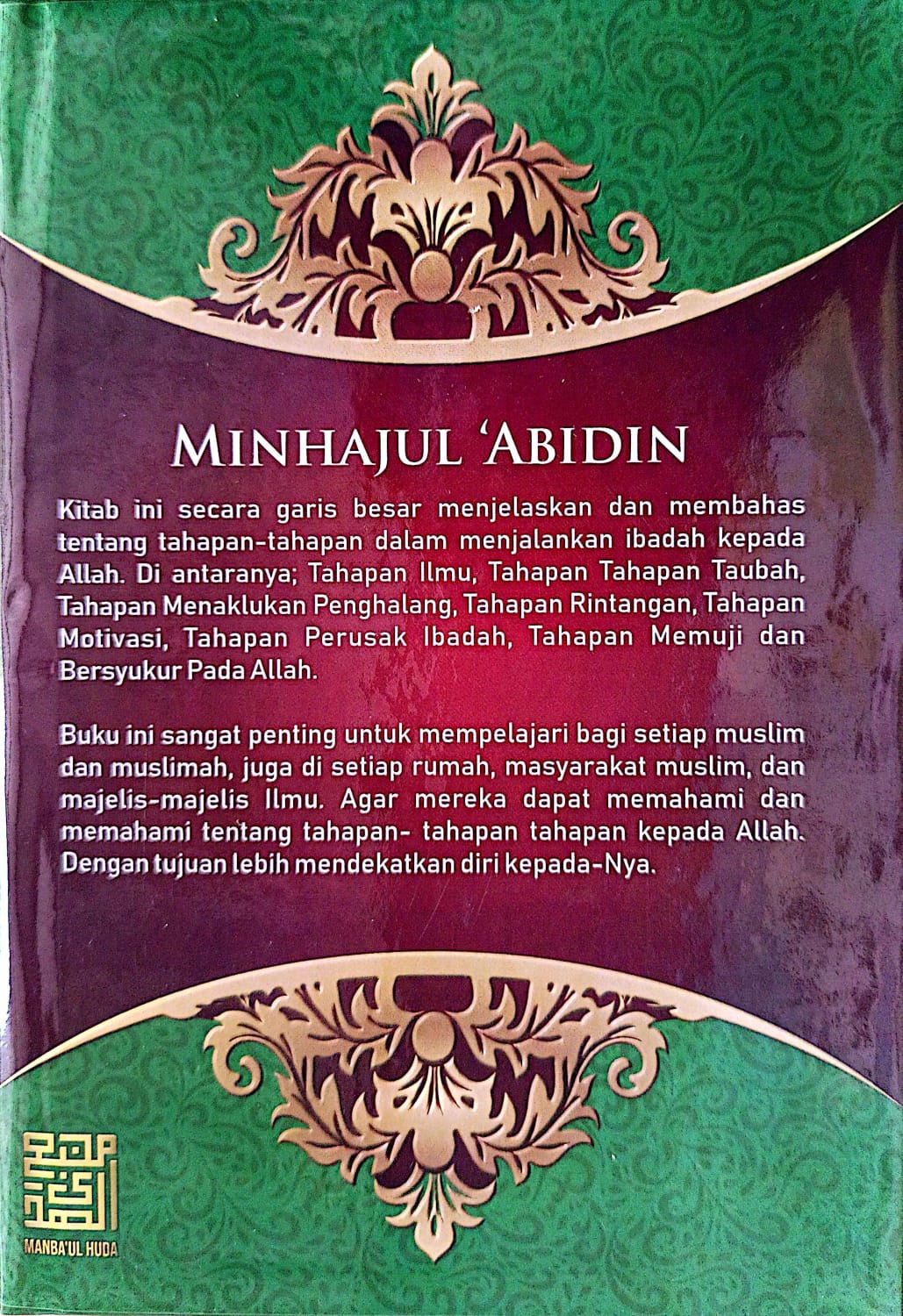 Kitab ini membimbing pembaca melalui tahapan-tahapan ibadah dan perjuangan melawan hawa nafsu, mulai dari ilmu dan taubat, menghadapi godaan syaitan, hingga mencapai keikhlasan dan ridha Allah. Disusun dengan bahasa yang mendalam namun sistematis, Minhājul ā€˜Ä€bidÄ«n menjadi kitab rujukan penting dalam tradisi pesantren dan kajian tasawuf Ahlussunnah wal Jama’ah.
