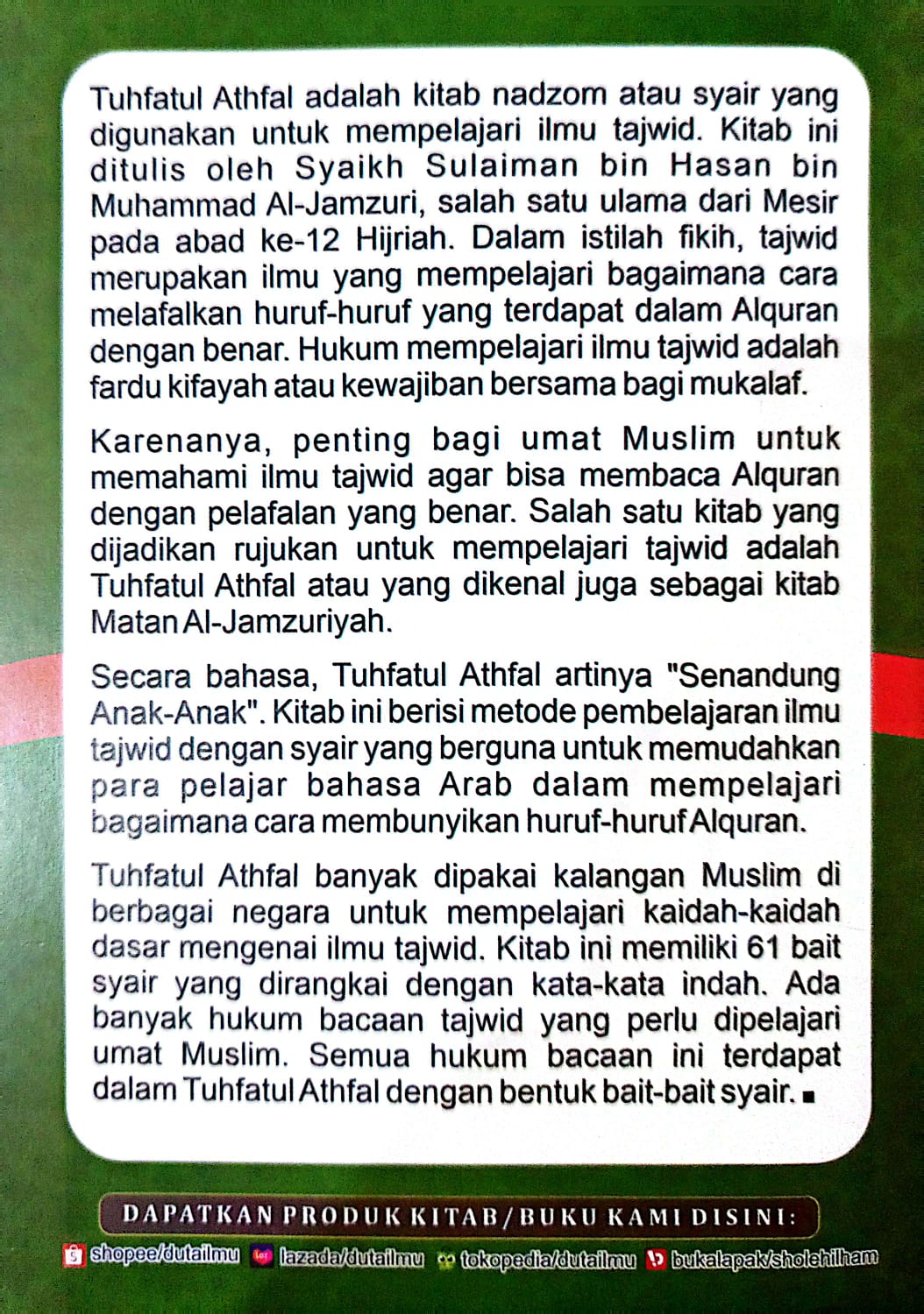 Terjemah Kitab Tuhfatul Athfal merupakan edisi khusus dari karya ulama besar Sulaiman bin Husain Muhammad al-Jamzuri, sebuah matan penting dalam ilmu tajwid yang telah digunakan secara luas di berbagai pesantren, TPQ, dan lembaga pendidikan Al-Qur’an. Kitab ini membahas kaidah-kaidah tajwid dasar secara ringkas namun padat, sehingga menjadi rujukan utama bagi pemula yang ingin membaca Al-Qur’an dengan benar.